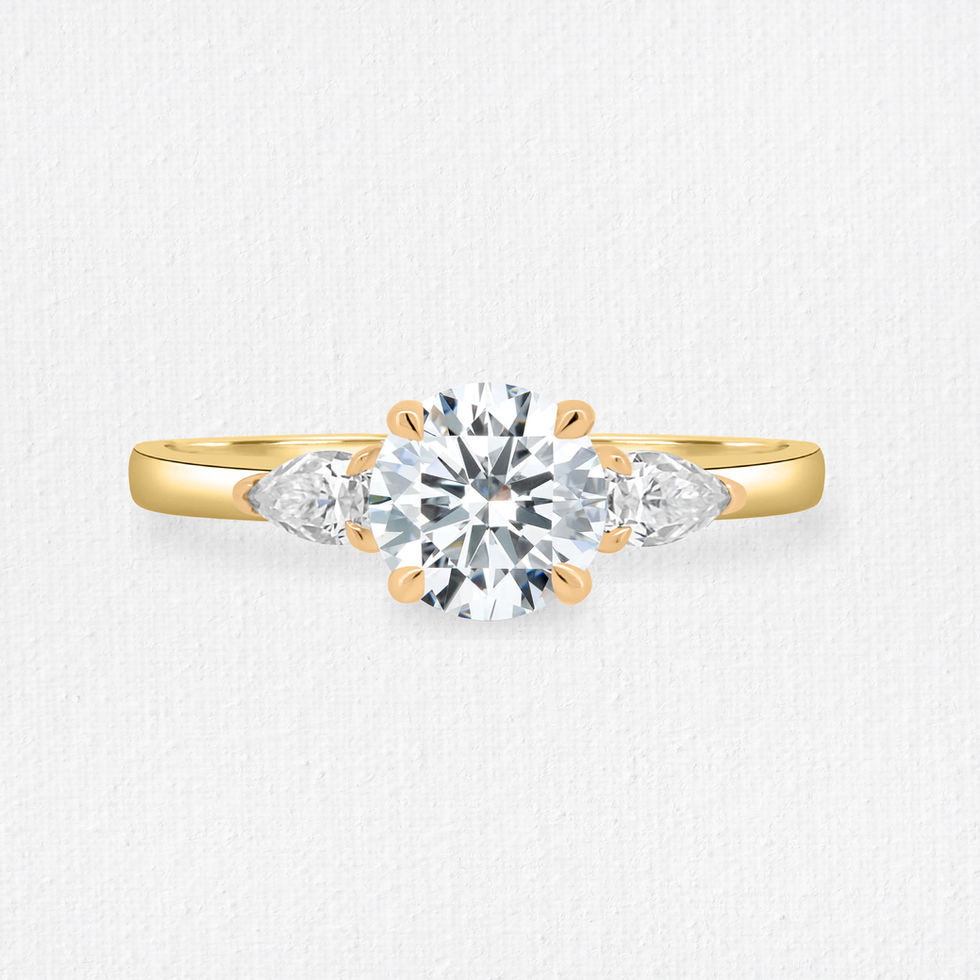 The Carson ring showcases a 1ct round center stone, flanked by two pear-cut diamonds for a modern take on the classic trilogy design. Set on a sleek plain band, this piece symbolizes your past, present, and future in a refined, elegant silhouette.
