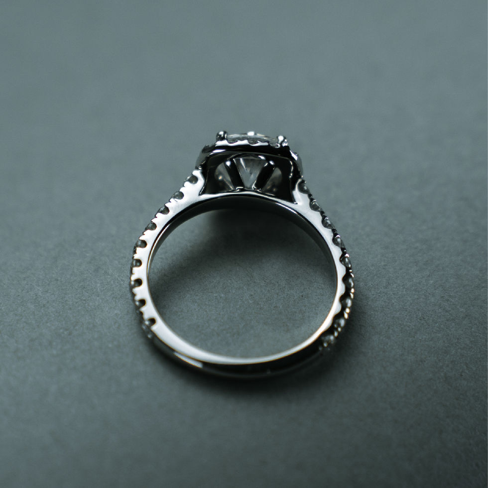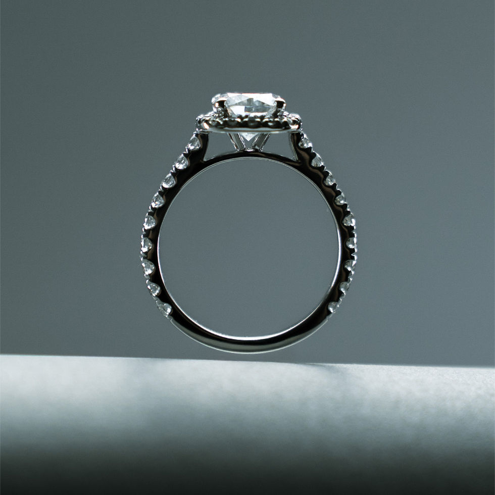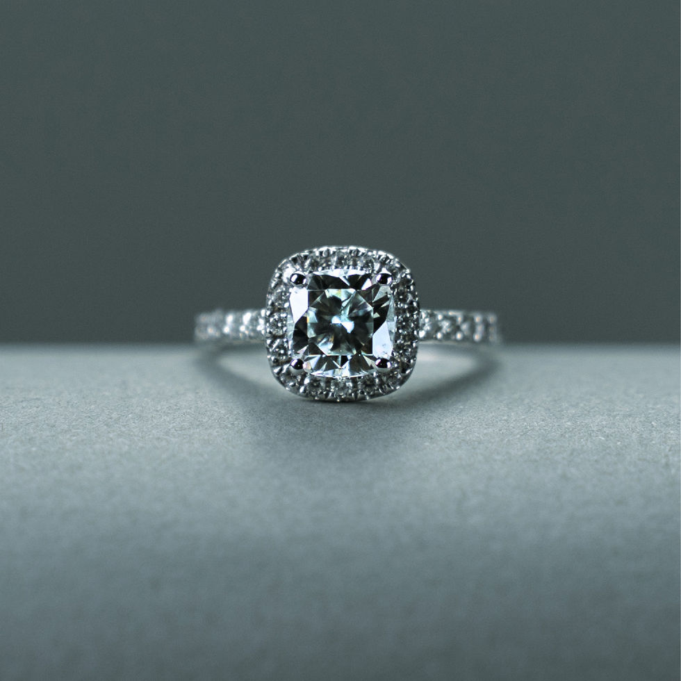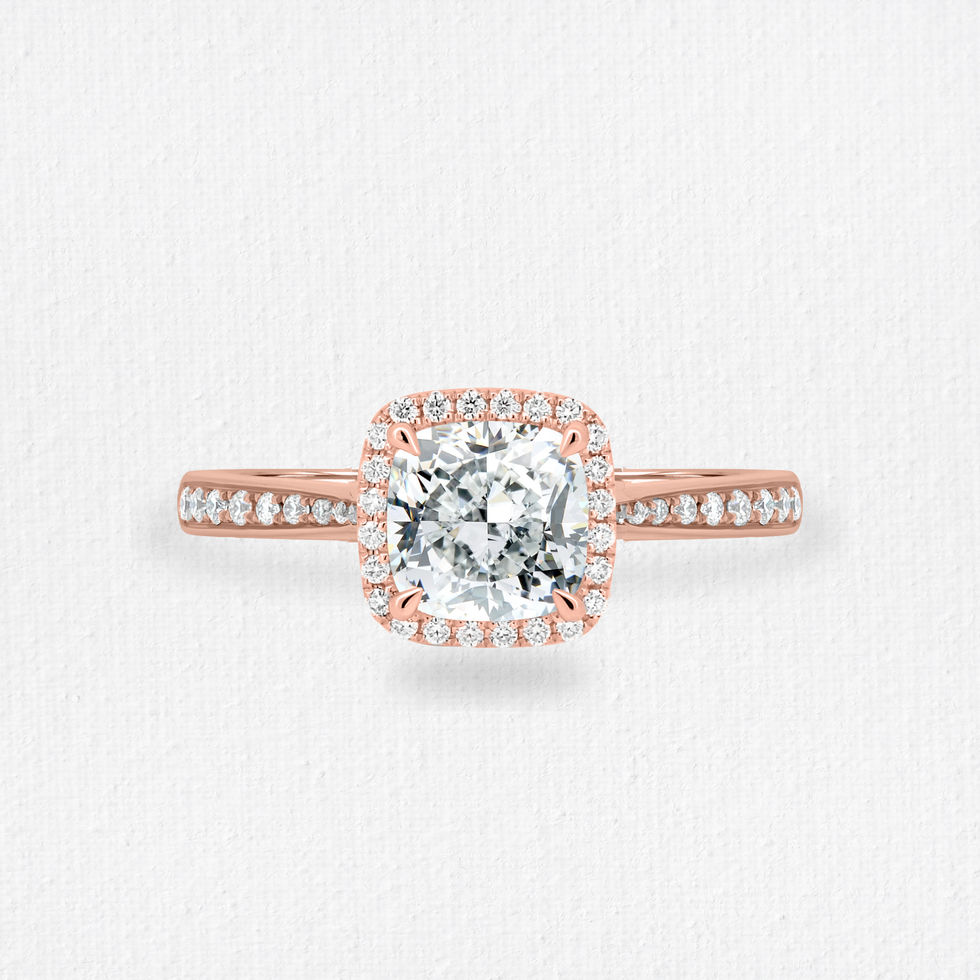 The Genevieve ring showcases a square cushion cut center stone, embraced by a shimmering halo that enhances its brilliance. Set on a pavé band, this design sparkles from every angle—elegant, radiant, and timelessly romantic.